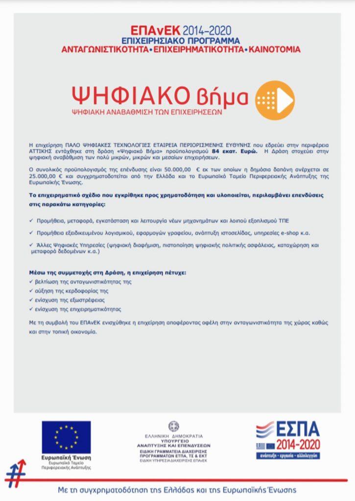 Η επιχείρηση ΠΑΛΟ ΨΗΦΙΑΚΕΣ ΤΕΧΝΟΛΟΓΙΕΣ ΕΤΑΙΡΕΙΑ ΠΕΡΙΟΡΙΣΜΕΝΗΣ ΕΥΘΥΝΗΣ που εδρεύει στην περιφέρεια ΑΤΤΙΚΗΣ εντάχθηκε στη δράση «Ψηφιακό Βήμα» προϋπολογισμού 84 εκατ. Ευρώ.